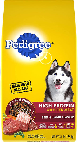 The PEDIGREE line of nutritionally balanced food helps ensure your dog can live their happiest and healthiest life. Our protein rich recipe is made with real red meat, and 25% more protein than Adult Complete Nutrition. It's always 100% complete and balanced for canines with no added sugar, no artificial flavors, and no high fructose corn syrup. Let PEDIGREE nourish your dog's skin and coat with essential fatty acids and minerals, and help clean your dog's teeth with unique crunchy kibble. Because with all the goodness that dogs share with us, we all want to do what's best for them.