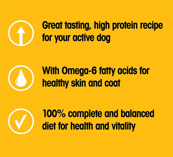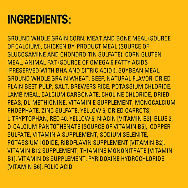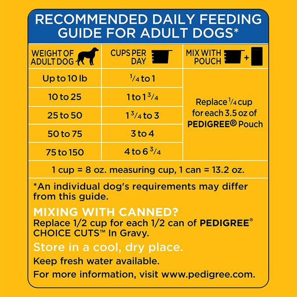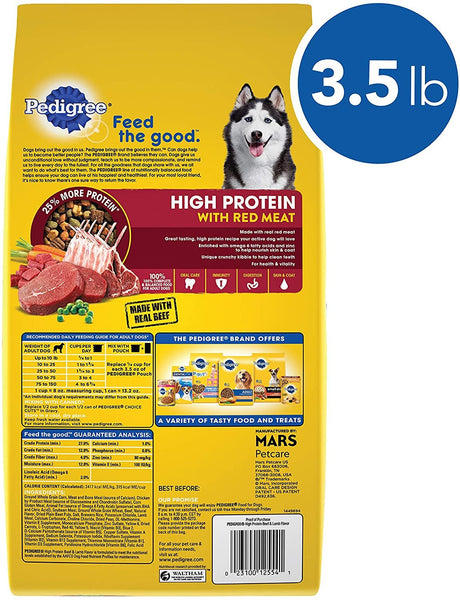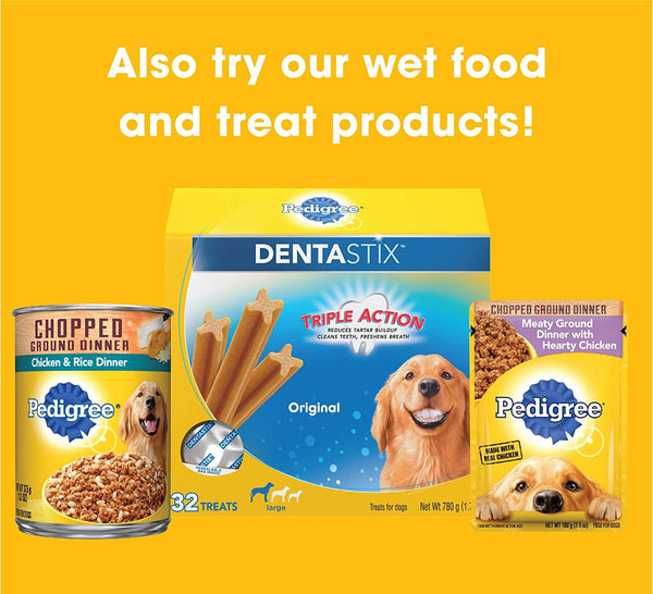 The PEDIGREE line of nutritionally balanced food helps ensure your dog can live their happiest and healthiest life. Our protein rich recipe is made with real red meat, and 25% more protein than Adult Complete Nutrition. It's always 100% complete and balanced for canines with no added sugar, no artificial flavors, and no high fructose corn syrup. Let PEDIGREE nourish your dog's skin and coat with essential fatty acids and minerals, and help clean your dog's teeth with unique crunchy kibble. Because with all the goodness that dogs share with us, we all want to do what's best for them.