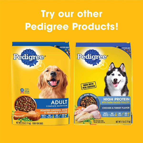 The PEDIGREE line of nutritionally balanced food helps ensure your dog can live their happiest and healthiest life. Our protein rich recipe is made with real red meat, and 25% more protein than Adult Complete Nutrition. It's always 100% complete and balanced for canines with no added sugar, no artificial flavors, and no high fructose corn syrup. Let PEDIGREE nourish your dog's skin and coat with essential fatty acids and minerals, and help clean your dog's teeth with unique crunchy kibble. Because with all the goodness that dogs share with us, we all want to do what's best for them.